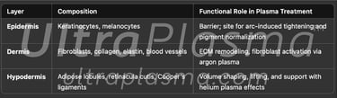 Understanding the spatial relationship between skin, fat, ligaments, and fascia allows precise targeting of plasma penetration zones based on energy and gas type.