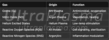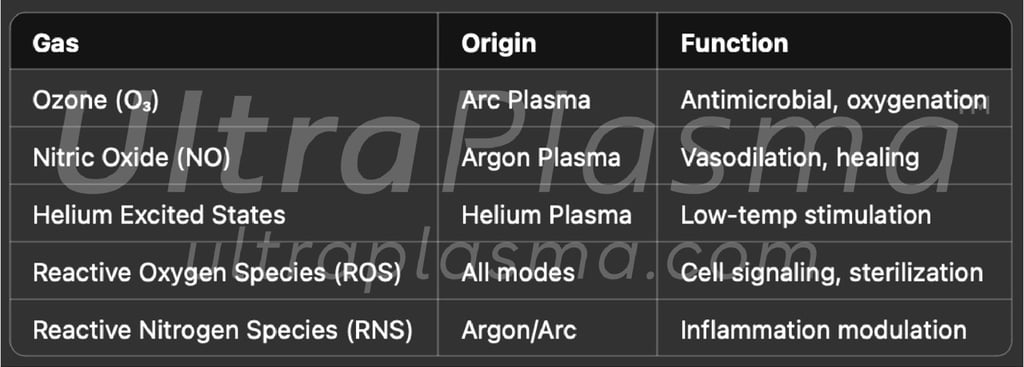 Ozone (O₃) generated by arc and argon plasma enhances oxygen availability and microbial eradication.