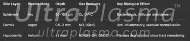 The UltraPlasma™ approach is fundamentally distinct in its ability to selectively target skin layers—epidermis, dermis, and hypodermis—through different plasma types (arc, argon, and helium) while delivering biochemically active gases such as ozone (O₃), nitric oxide (NO), and reactive oxygen/nitrogen species (RONS). This cross-sectional and gas-mediated specificity allows UltraPlasma™ not only to eliminate surface pathogens and biofilms but also to modulate inflammation, restore vascular function, and remodel subdermal fibrotic tissues that are hallmarks of advanced HS.