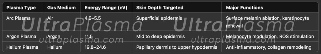 Hyperpigmentation represents a broad dermatological condition characterized by melanin accumulation within different skin layers. Effective treatment requires technologies that can penetrate precise skin depths, stimulate melanocyte regulation, and promote dermal remodeling. UltraPlasma™ technology—integrating arc, argon, and helium plasma emissions—offers a unique therapeutic approach. This paper explores the anatomical mechanisms, bioengineering principles, and clinical applications of UltraPlasma™ for hyperpigmentation, focusing on epidermis, dermis, and hypodermis interactions, with detailed discussions on gas-phase chemistry involving ozone (O₃), nitric oxide (NO), and reactive oxygen/nitrogen species (RONS). Figures illustrate emission profiles, skin penetration zones, biochemical flowcharts, and clinical outcomes.