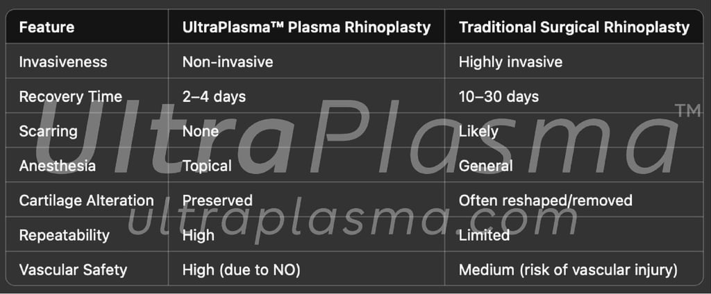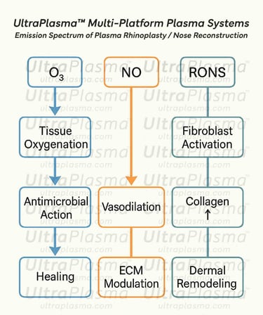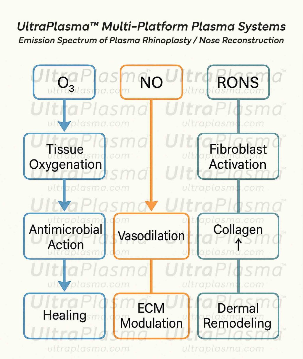UltraPlasma™ rhinoplasty represents a revolutionary, minimally invasive technique for reshaping and lifting the nasal structure. Utilizing UltraPlasma™ multi-platform plasma systems, which integrate arc plasma, argon plasma, and helium plasma, this method offers precise energy delivery to superficial and deep nasal tissues. This article explores the underlying biophysics, skin and cartilage response, and gas-mediated biochemical pathways, with a special focus on ozone (O₃), nitric oxide (NO), and reactive oxygen/nitrogen species (RONS). A comparative analysis with conventional surgical techniques is also presented. Figures illustrate cross-sectional tissue effects, gas interactions, and histological changes.
